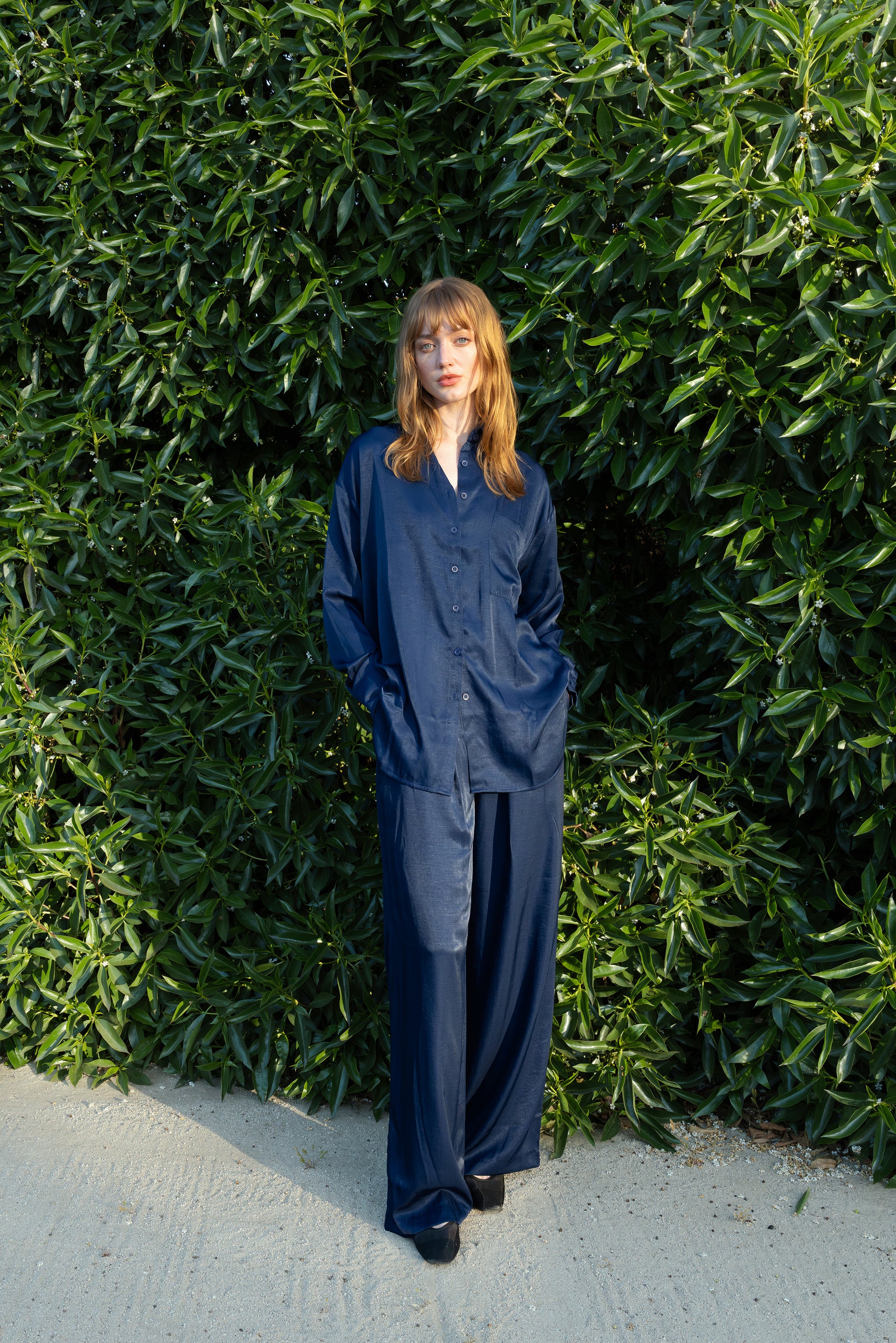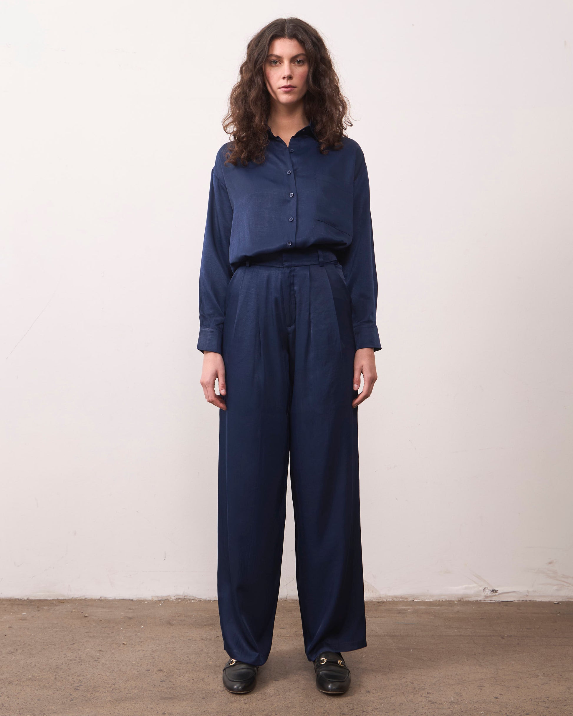 De tejido suave y sedoso, esta blusa destaca por su leve brillo y caída suelta, que acompaña el movimiento con naturalidad y elegancia. Puede ir a juego con nuestro pantalón cupro, creando una tenida llamativa para ocasiones especiales o un look ideal de noche.