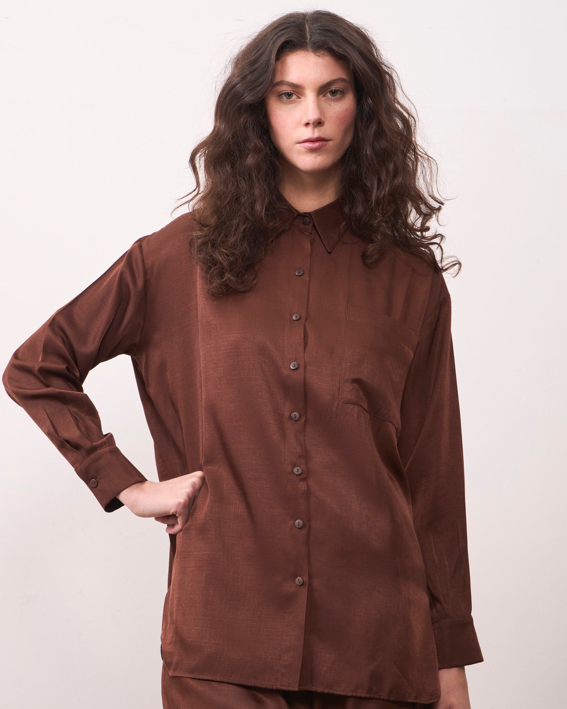 De tejido suave y sedoso, esta blusa destaca por su leve brillo y caída suelta, que acompaña el movimiento con naturalidad y elegancia. Puede ir a juego con nuestro pantalón cupro, creando una tenida llamativa para ocasiones especiales o un look ideal de noche.