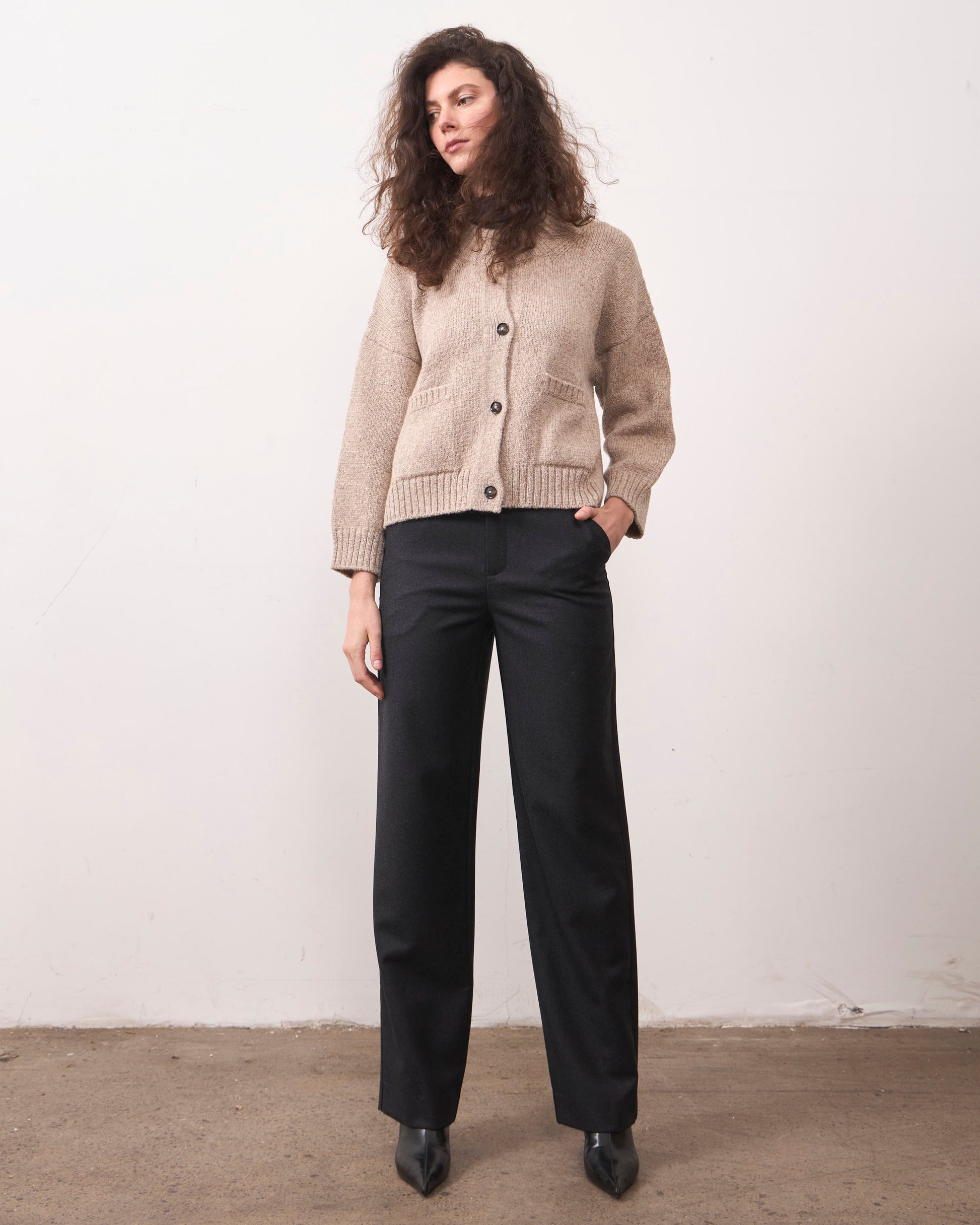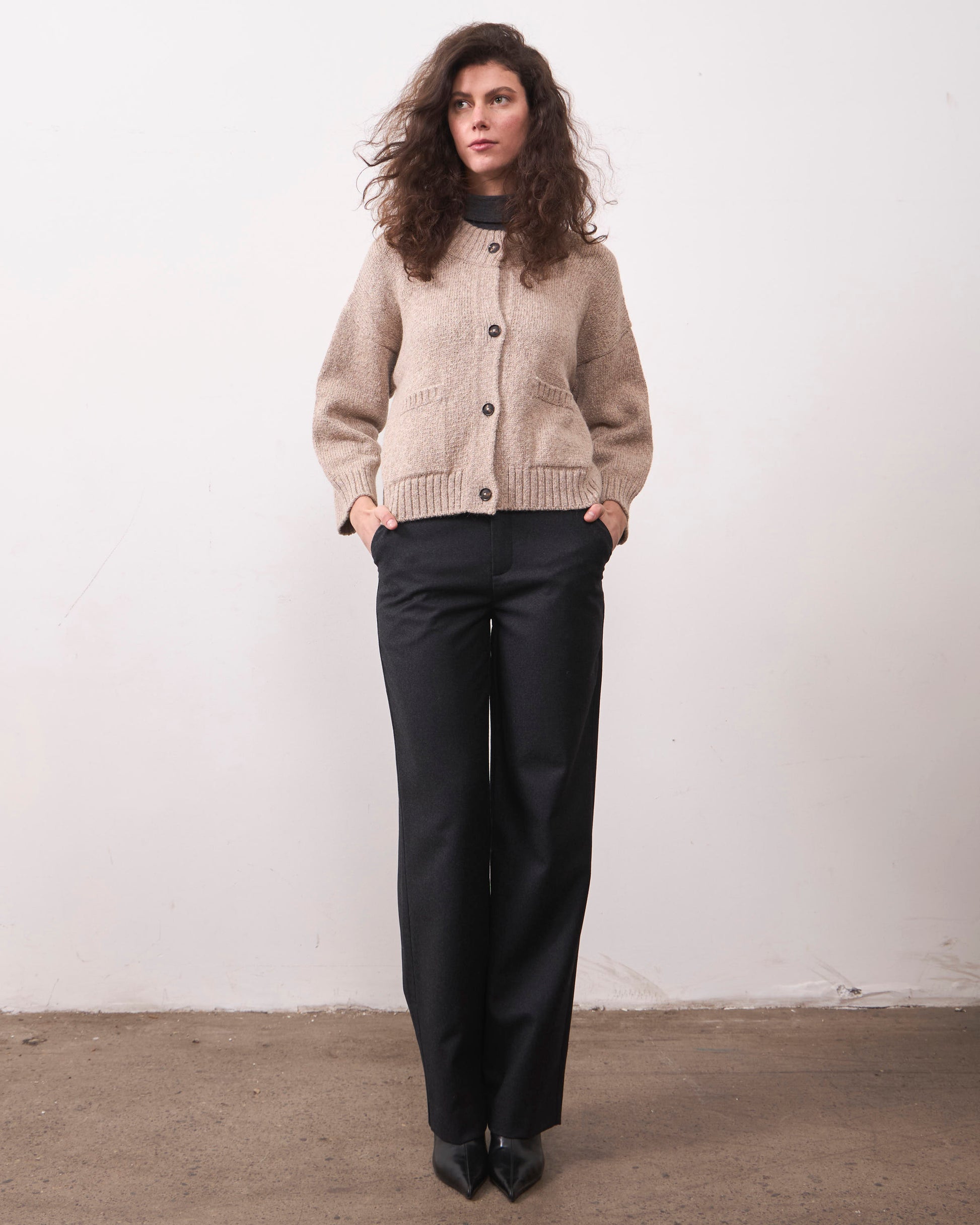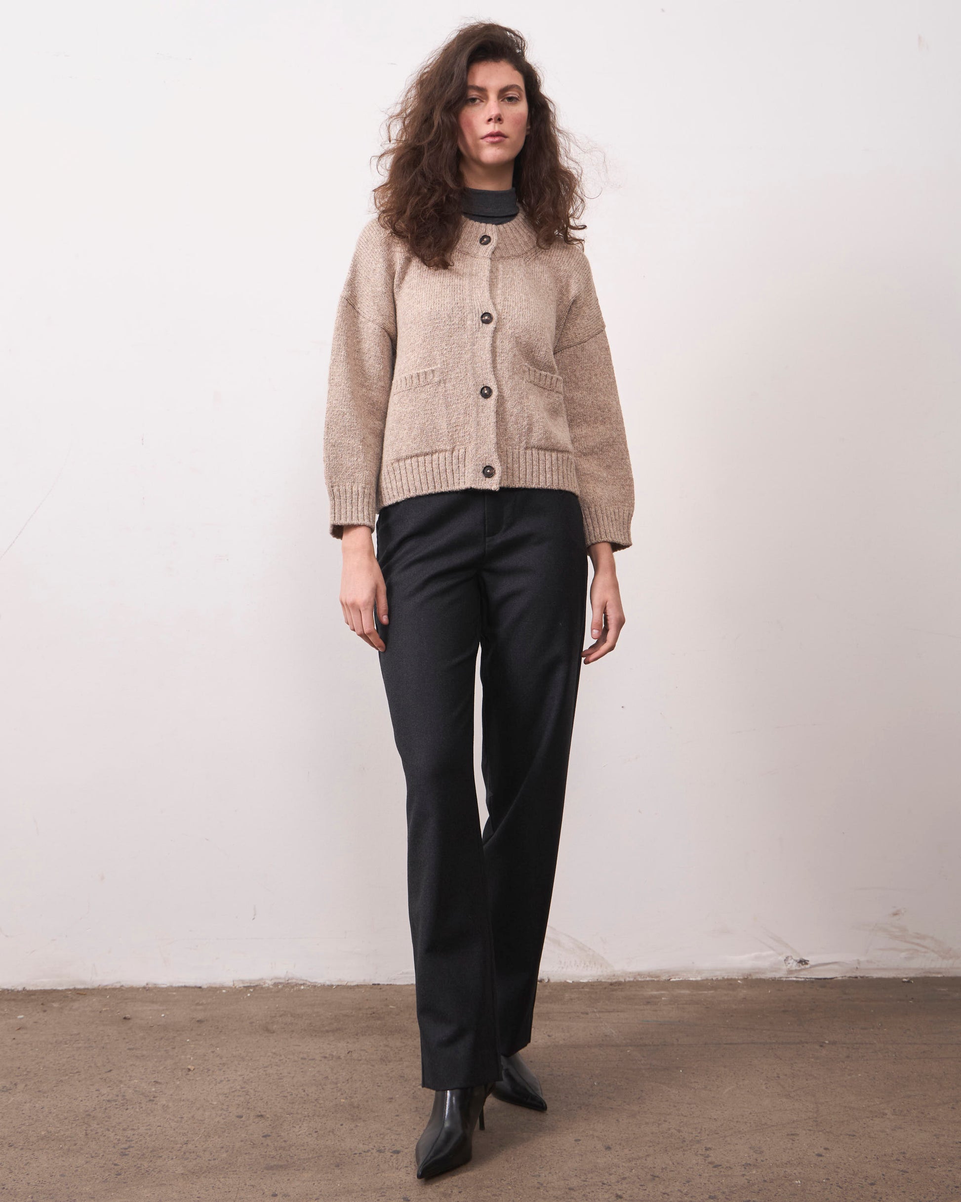 Chaleco de punto con cuello alto y botones al frente. De corte recto y largo a la cintura, combina una silueta amplia con detalles prácticos como bolsillos de parche y manga caída. Su tejido grueso le da estructura sin perder comodidad, ideal para poner sobre capas durante el invierno.