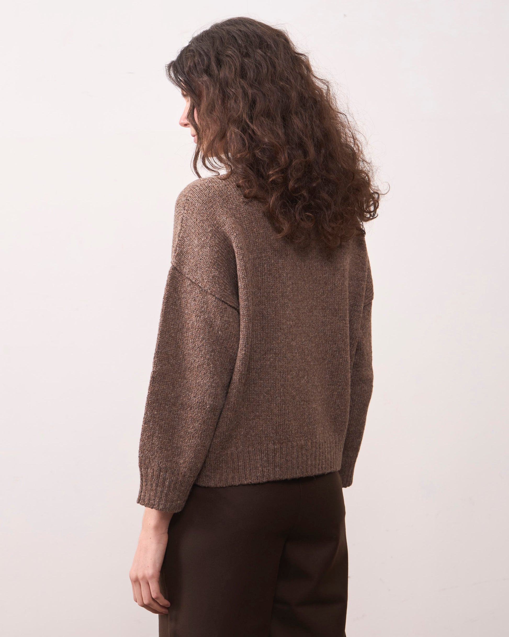 Chaleco de punto con cuello alto y botones al frente. De corte recto y largo a la cintura, combina una silueta amplia con detalles prácticos como bolsillos de parche y manga caída. Su tejido grueso le da estructura sin perder comodidad, ideal para poner sobre capas durante el invierno.
