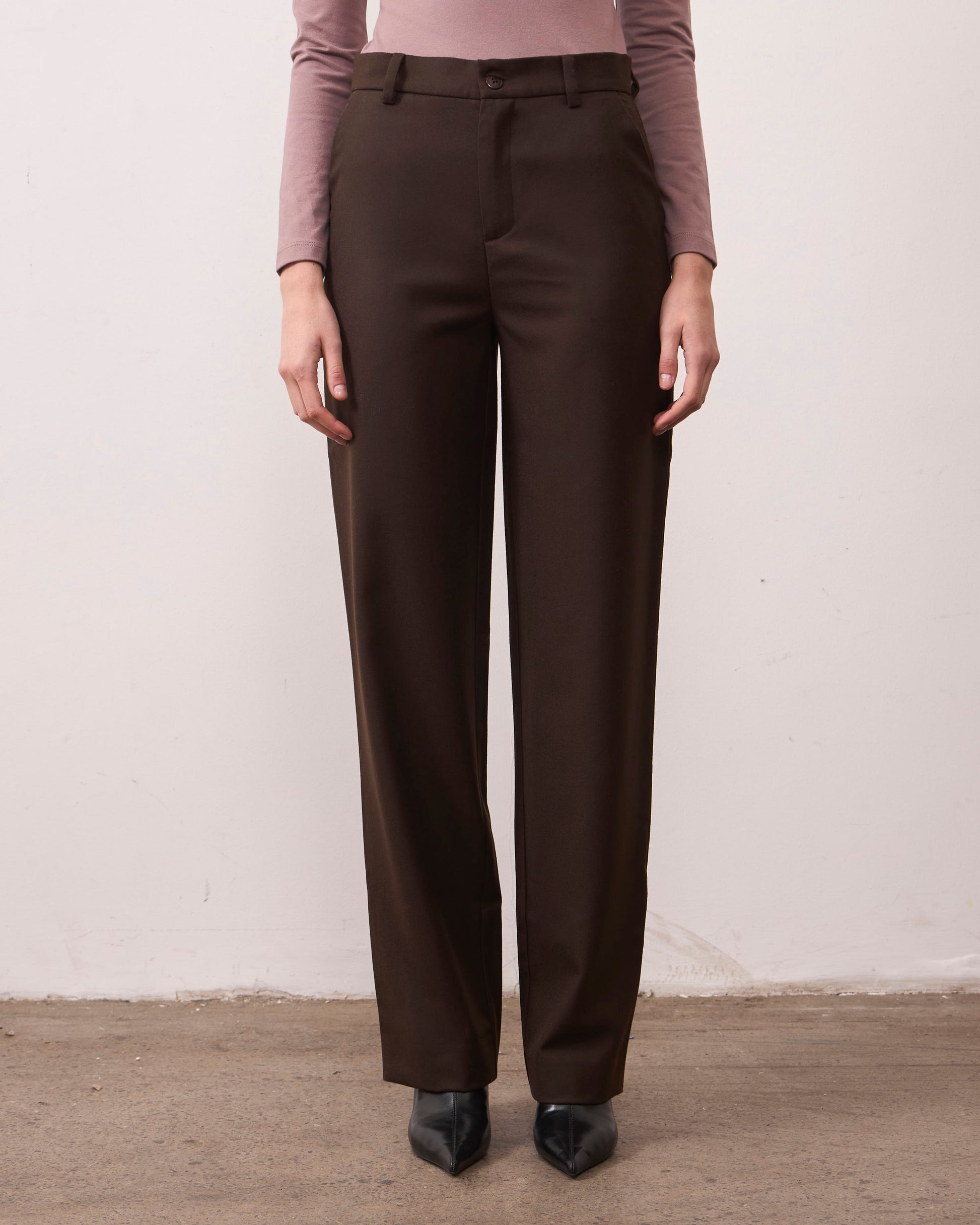 Su corte recto y tiro alto ofrecen una silueta favorecedora. El acabado suave del tejido aporta elegancia, ideal tanto para ocasiones formales como para un estilo refinado en el día a día.