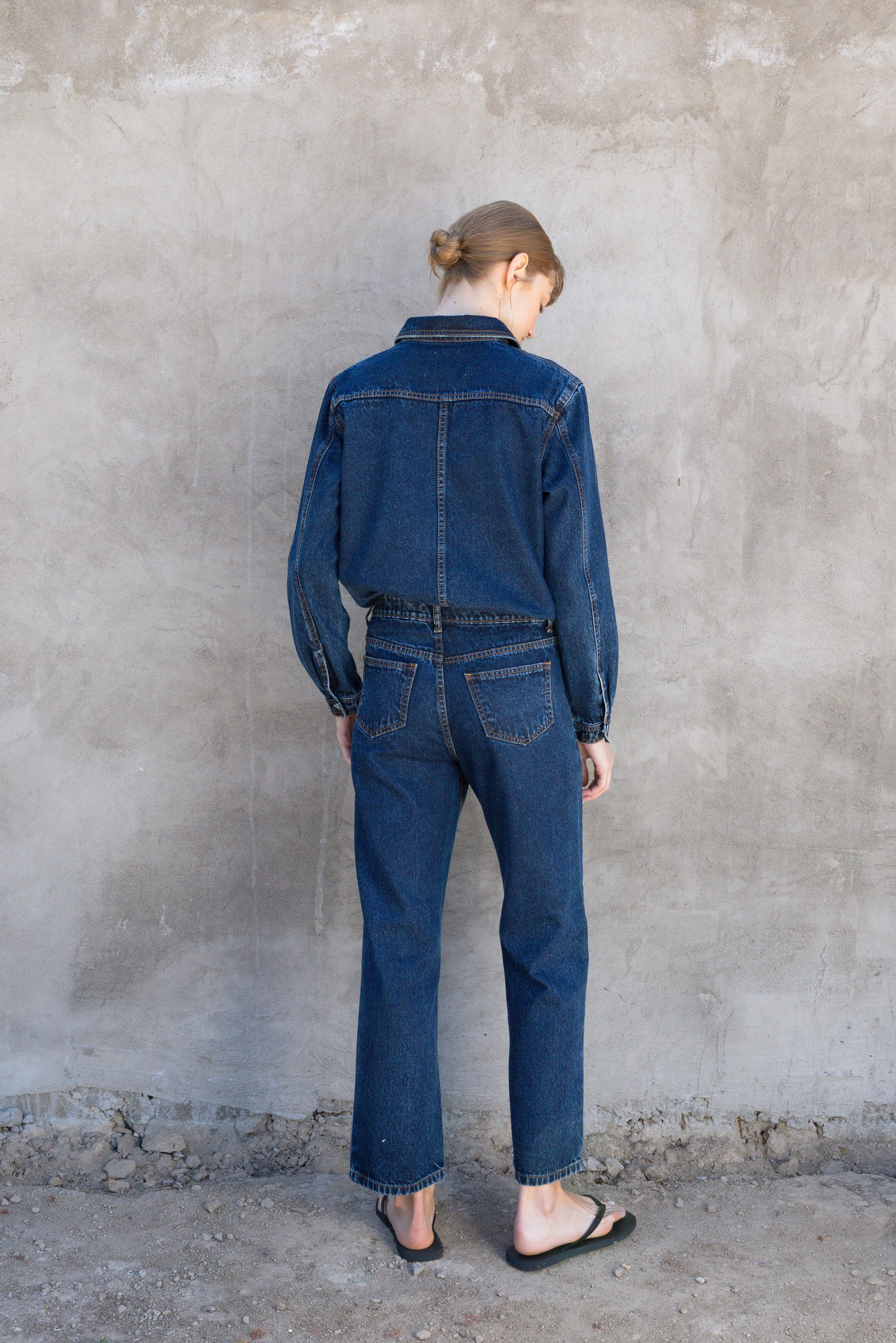 Pantalón de denim en tono azul profundo, confeccionado con un tejido delgado y veraniego que lo hace muy cómodo de usar. Tiene un calce excelente: recto, favorecedor y fácil de llevar durante todo el día.