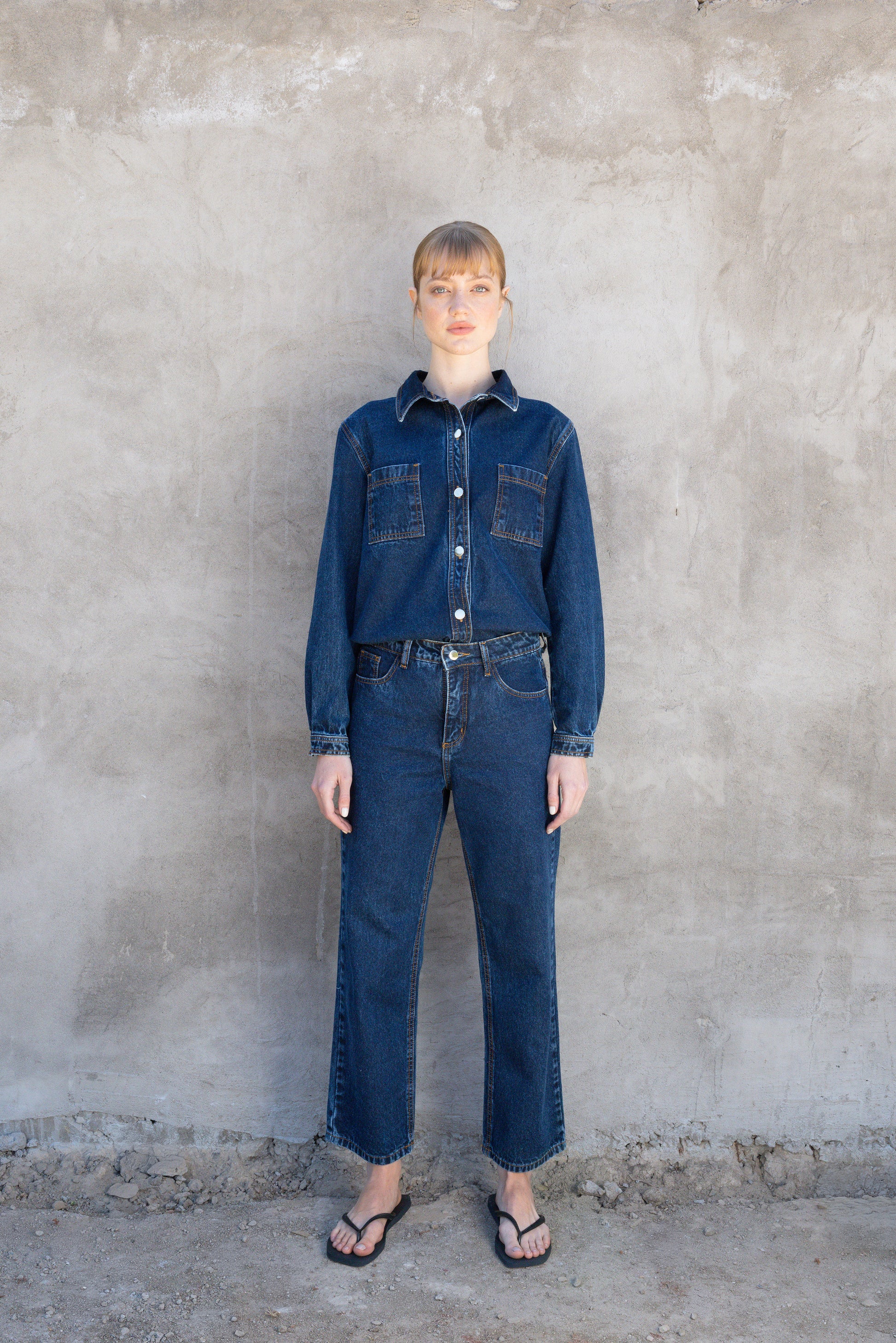Su largo al tobillo y su caída ligera lo convierten en una pieza versátil para la temporada. Perfecto para combinar con nuestra Camisa Risco Azul, creando un look completo en denim.